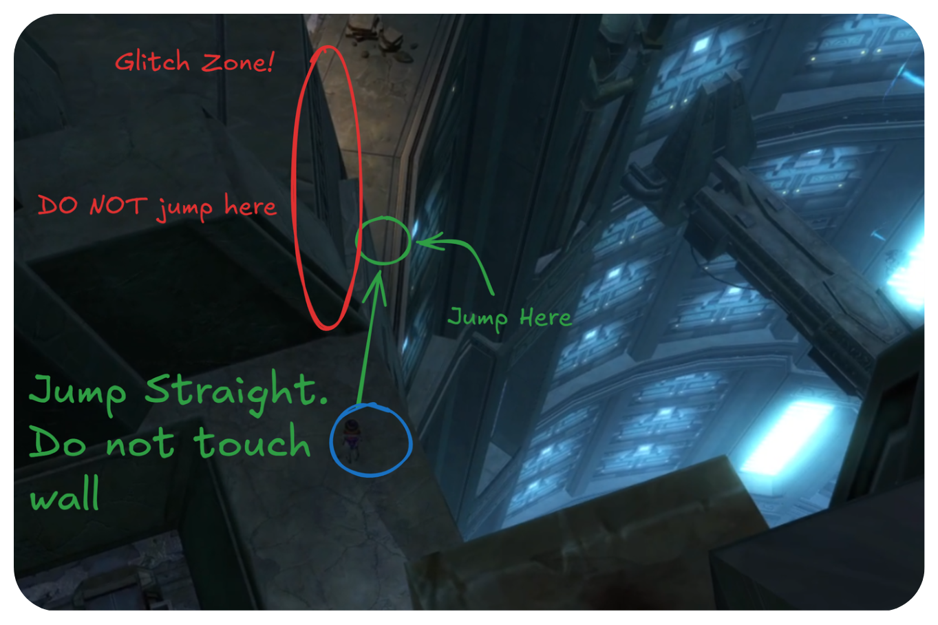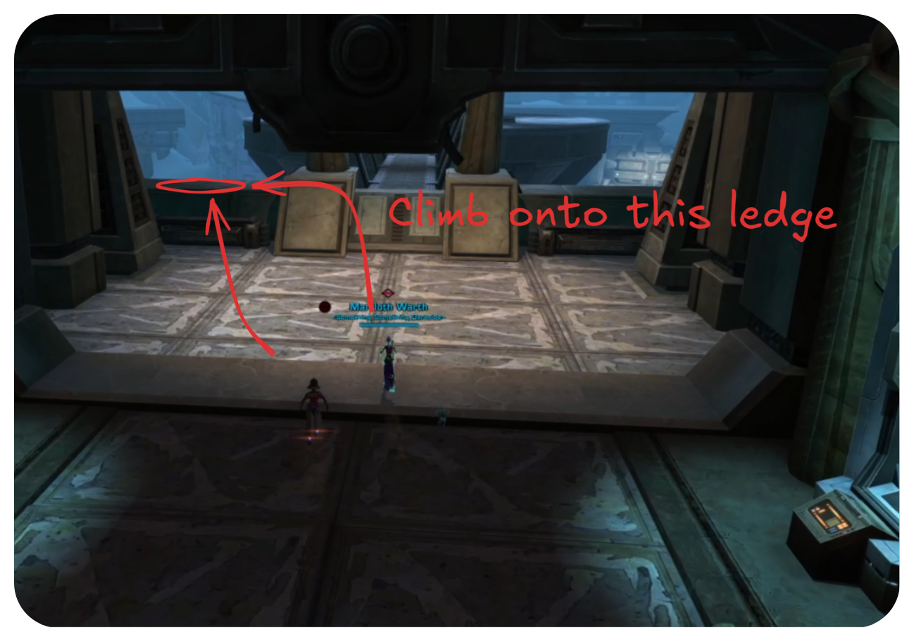 If you’re being pulled, instead of jumping across the void, there is a small landing area right under the ledge you jump from. Simply walk off the ledge to land here. Best to walk off backwards if it's your first time. Only once you are on the ledge at the bottom will you be in range of the pull player.