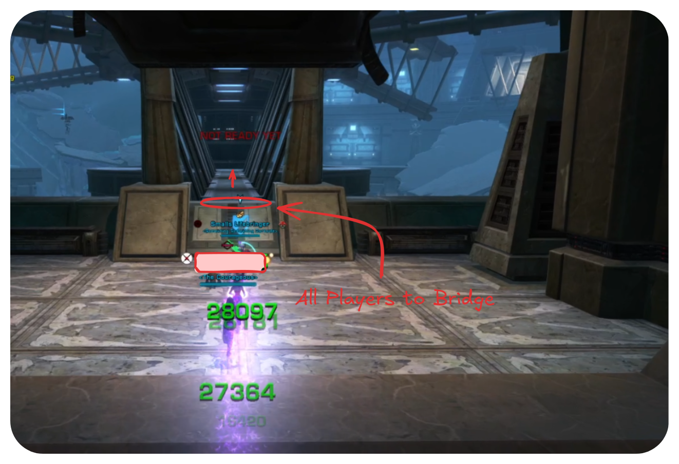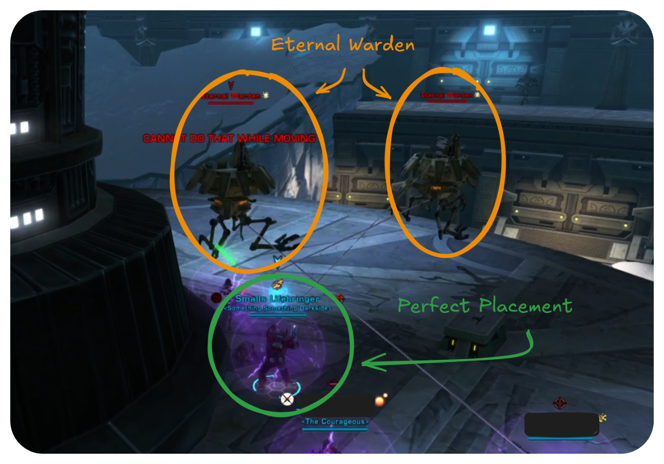 If there are no stealth players, then all players move towards the bridge in the next room. Once to the next platform. Position your back towards the pillars. The Eternal Warden enemies have knock back abilities.